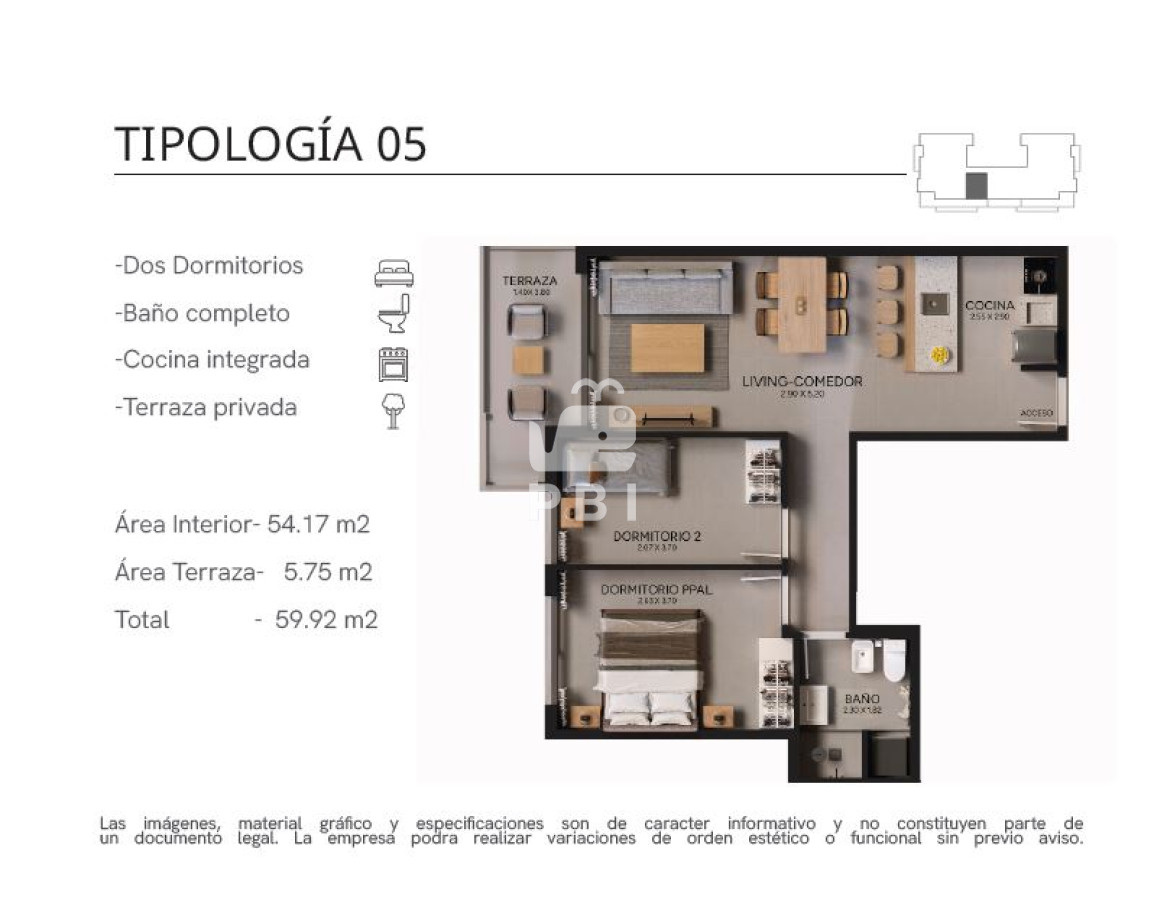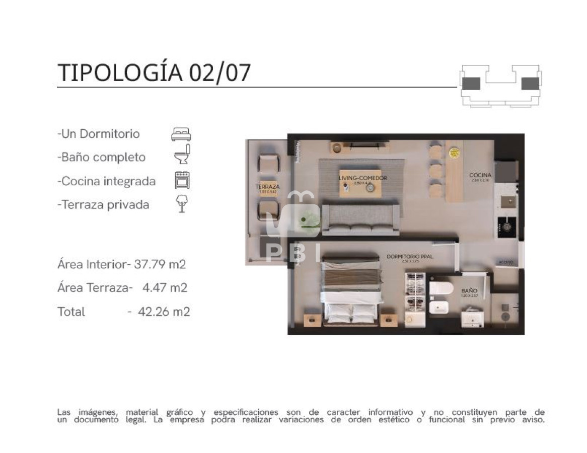 Con una superficie de 42m². El apartamento cuenta con 2 dormitorios, 1 baño, living comedor, cocina integrada y terraza