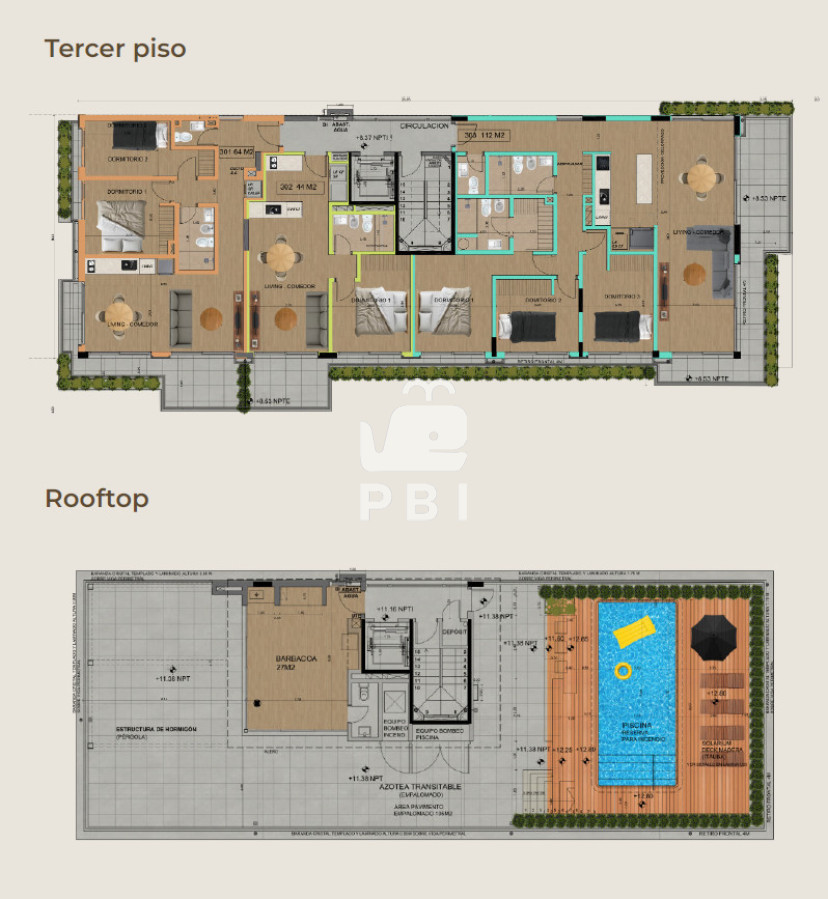 La propuesta incluye una torre de 4 niveles con apartamentos de 1, 2 y 3 dormitorios, cuyas superficies totales vendibles oscilan entre 52 m² y 288 m², según tipología. Las unidades cuentan con amplios interiores, terrazas generosas y participación en áreas comunes, logrando espacios luminosos y funcionales.